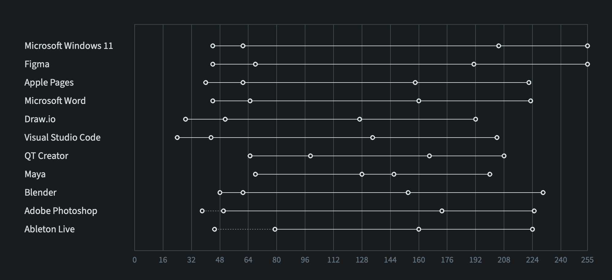Another interesting observation: no application uses background colors that are close to the darkest available RGB colors. Even the darkest Microsoft Visual Studio Code background is almost outside of 10% darkest range, and most others fall outside the range of 15% darkest gray colors.