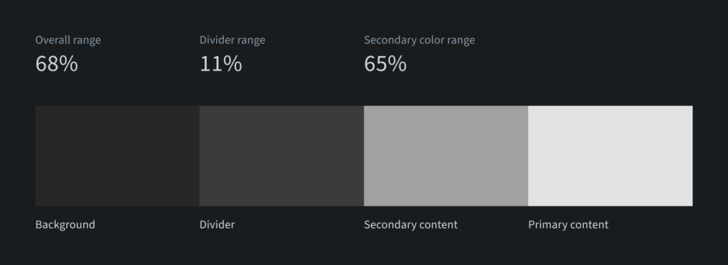 As we can see without any numbers, all the applications cover only part of the available range from black to white colors, so no application utilized a fully black background with a fully white primary content color. It makes the contrast softer, and there are reasons that we will skip in this research.